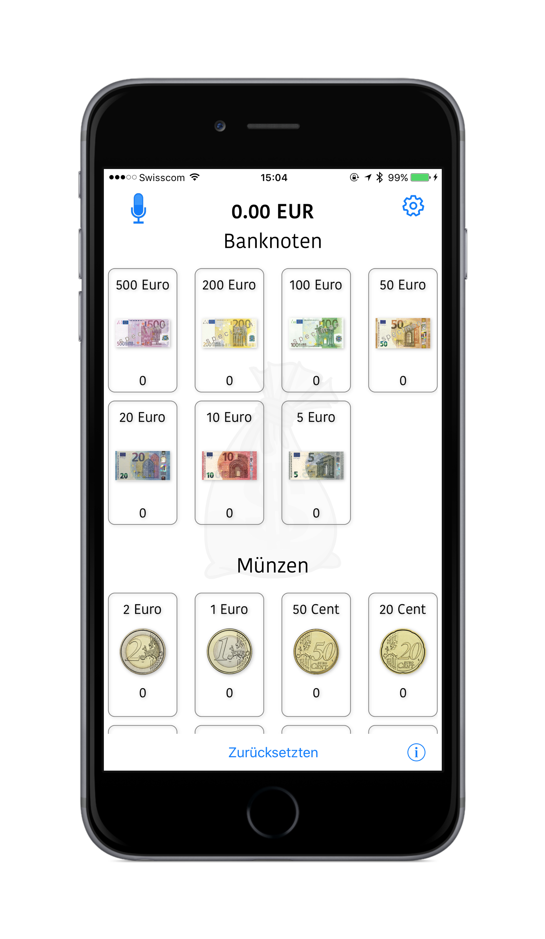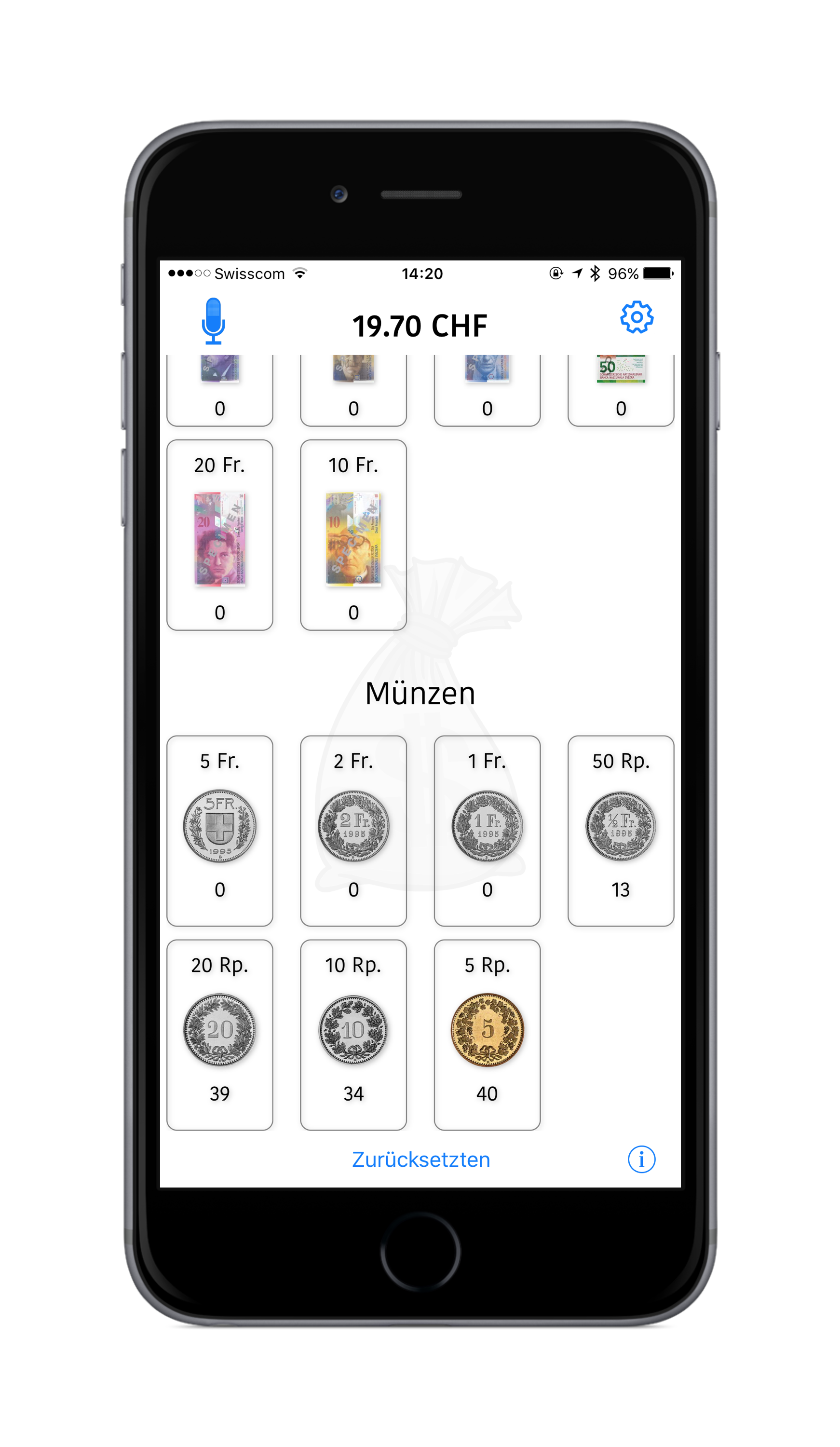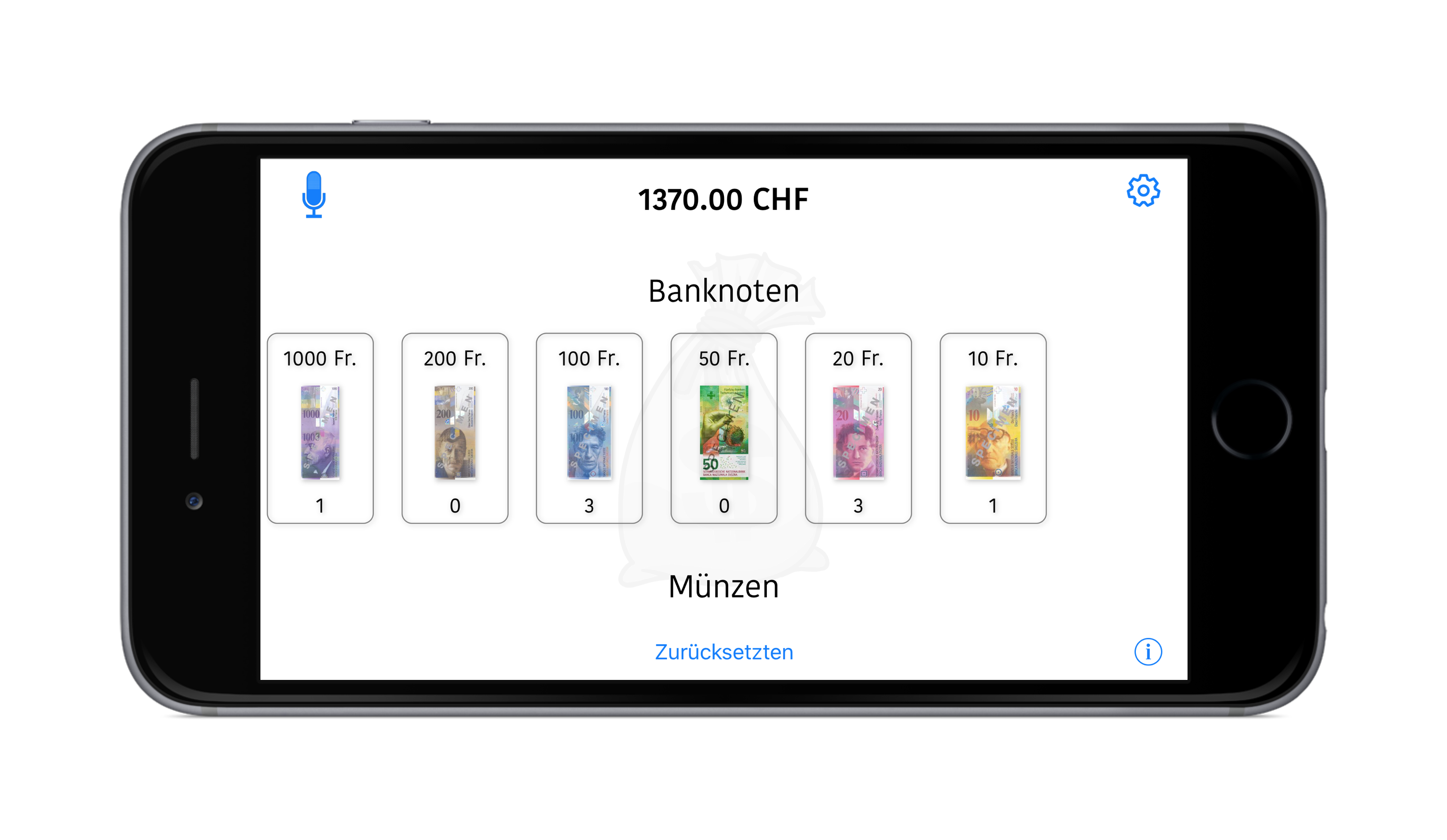 Diese kleine App ist ein kleiner Helfer, um Geld zu zählen. Insbesondere bei grösseren Geldmengen (viele Banknoten, viele Münzen) ein praktischer Helfer.