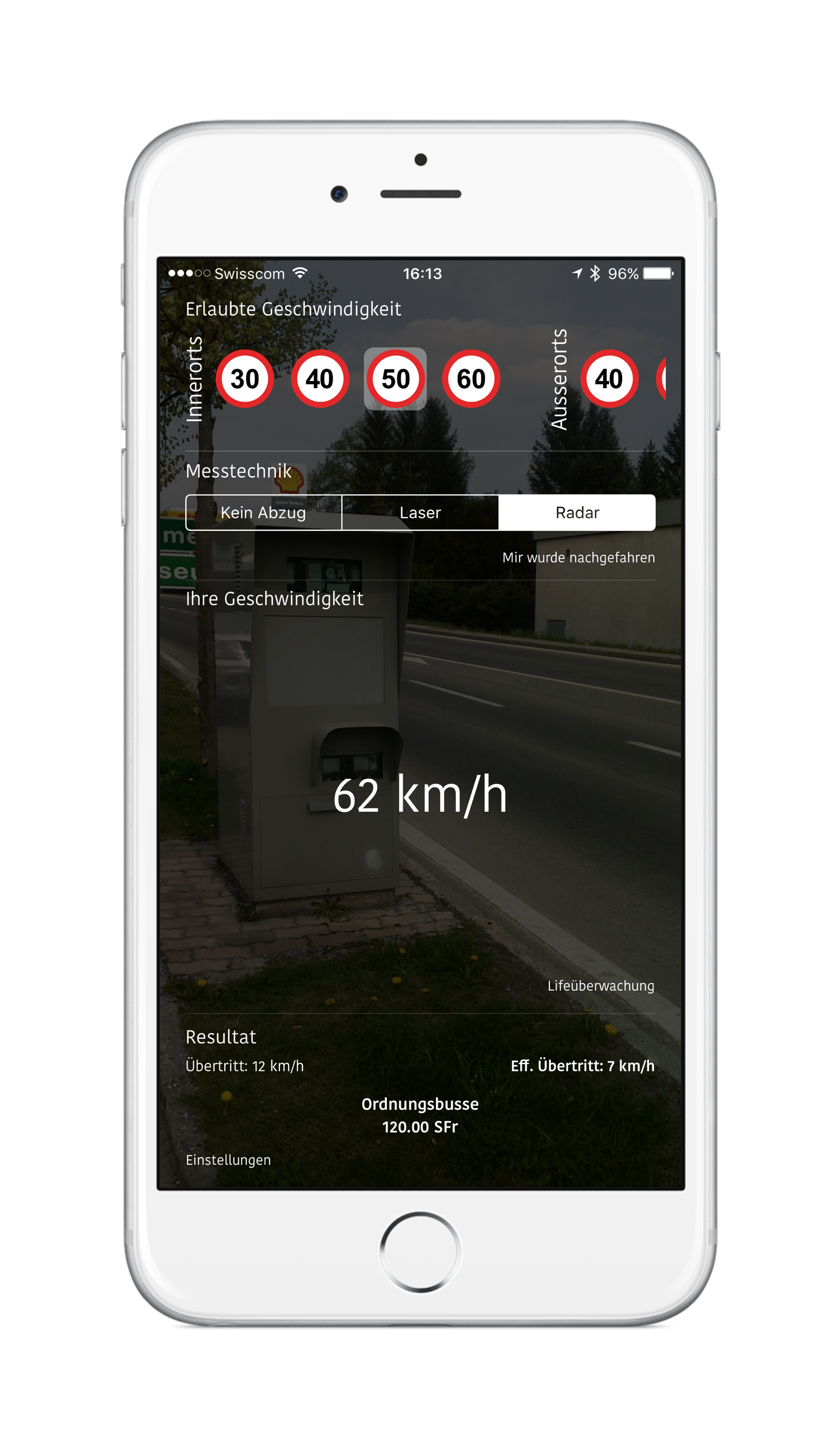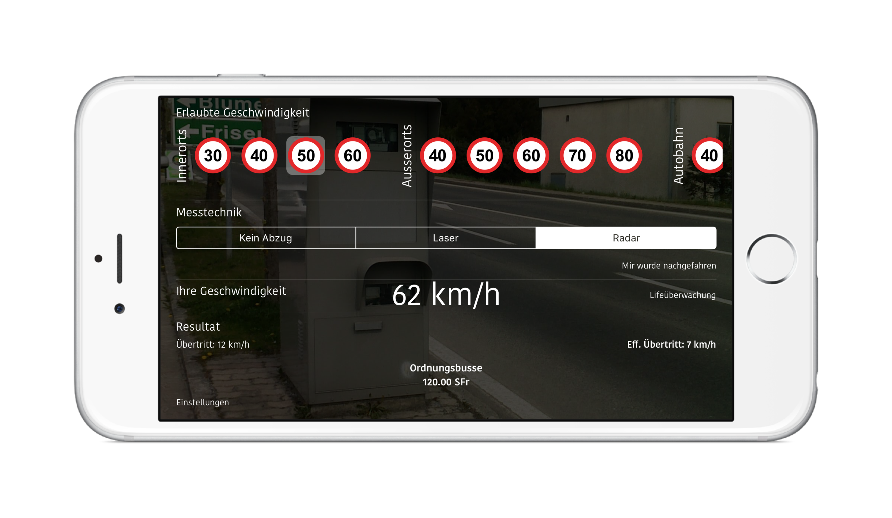 Wir können es nicht billiger machen, dir aber vorab wenigstens mitteilen, was es kosten wird... Im Gegensatz zu einigen Apps, die du aus dem Store kennst, kann unser Bussenrechner auch die Tagessätze bei höheren Geschwindigkeiten ausrechnen. Zudem kannst sie dir auch Live die Geschwindigkeit ermitteln und dir schon während der Fahrt, live mitteilen, wie hoch die Busse ist und ab wann du in ein Strafverfahren rein läufst.
