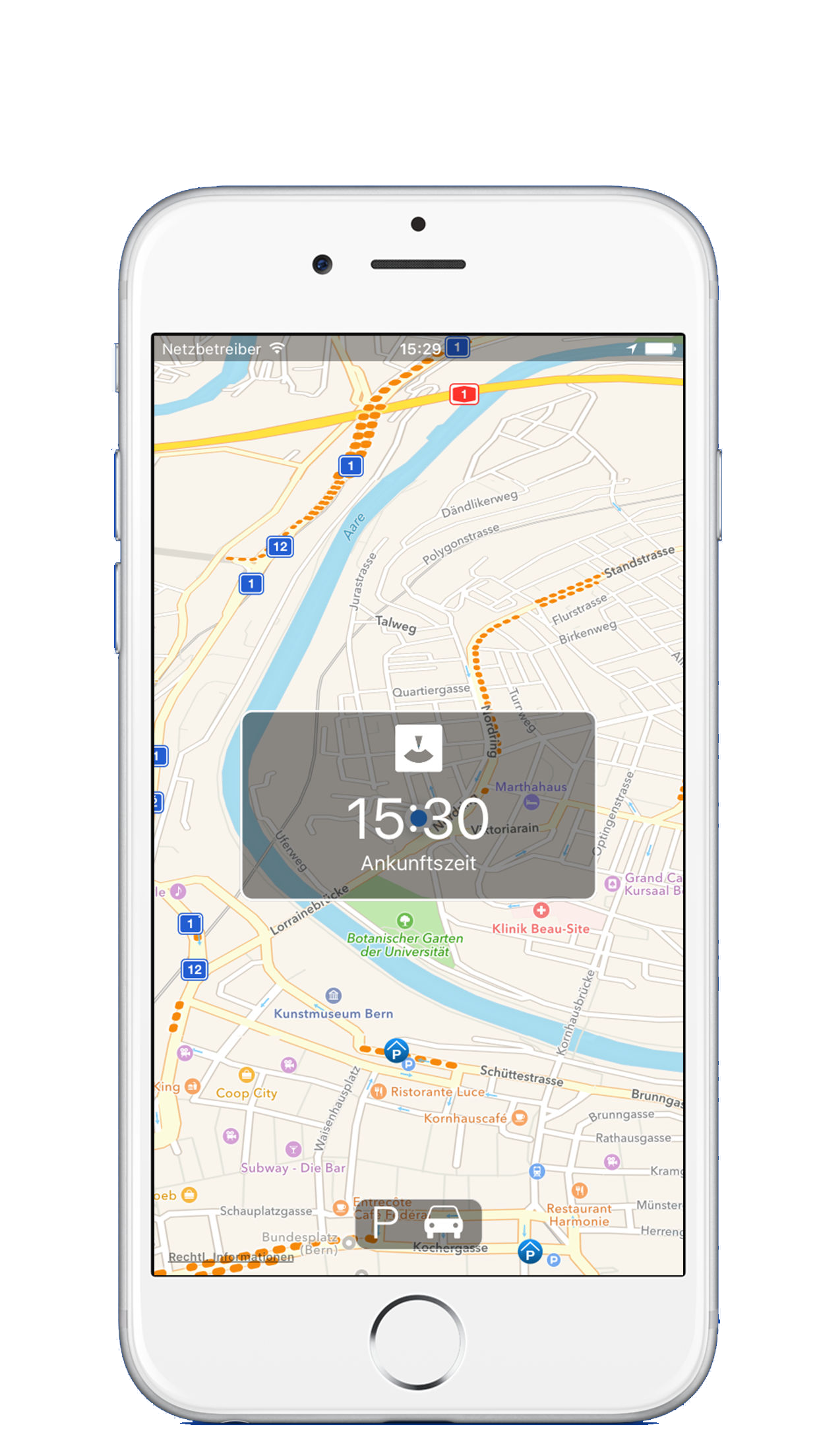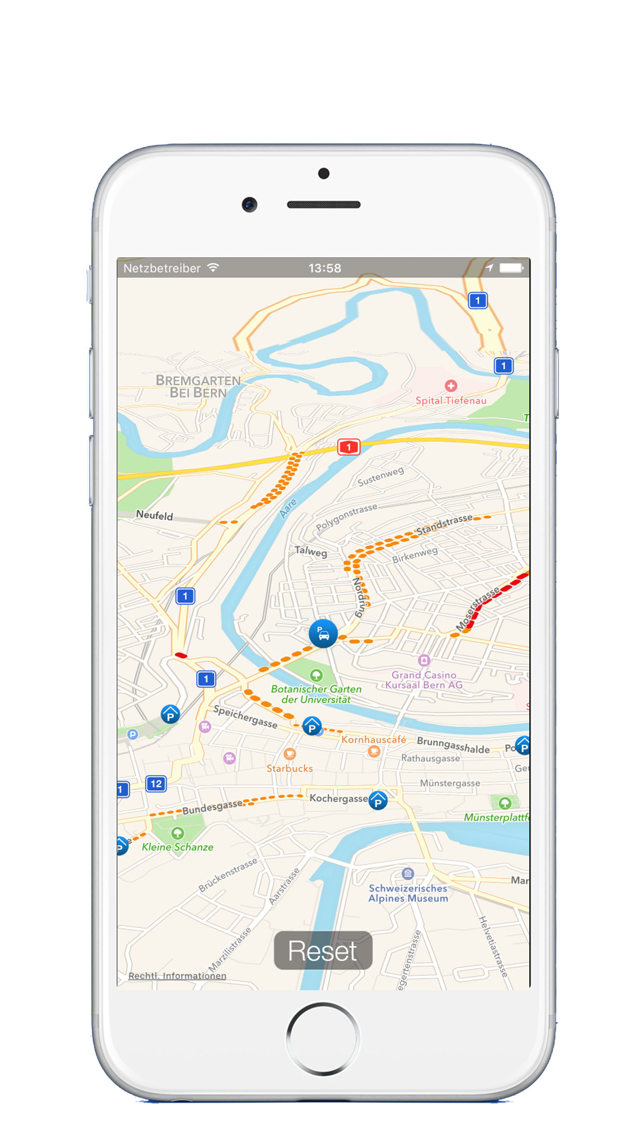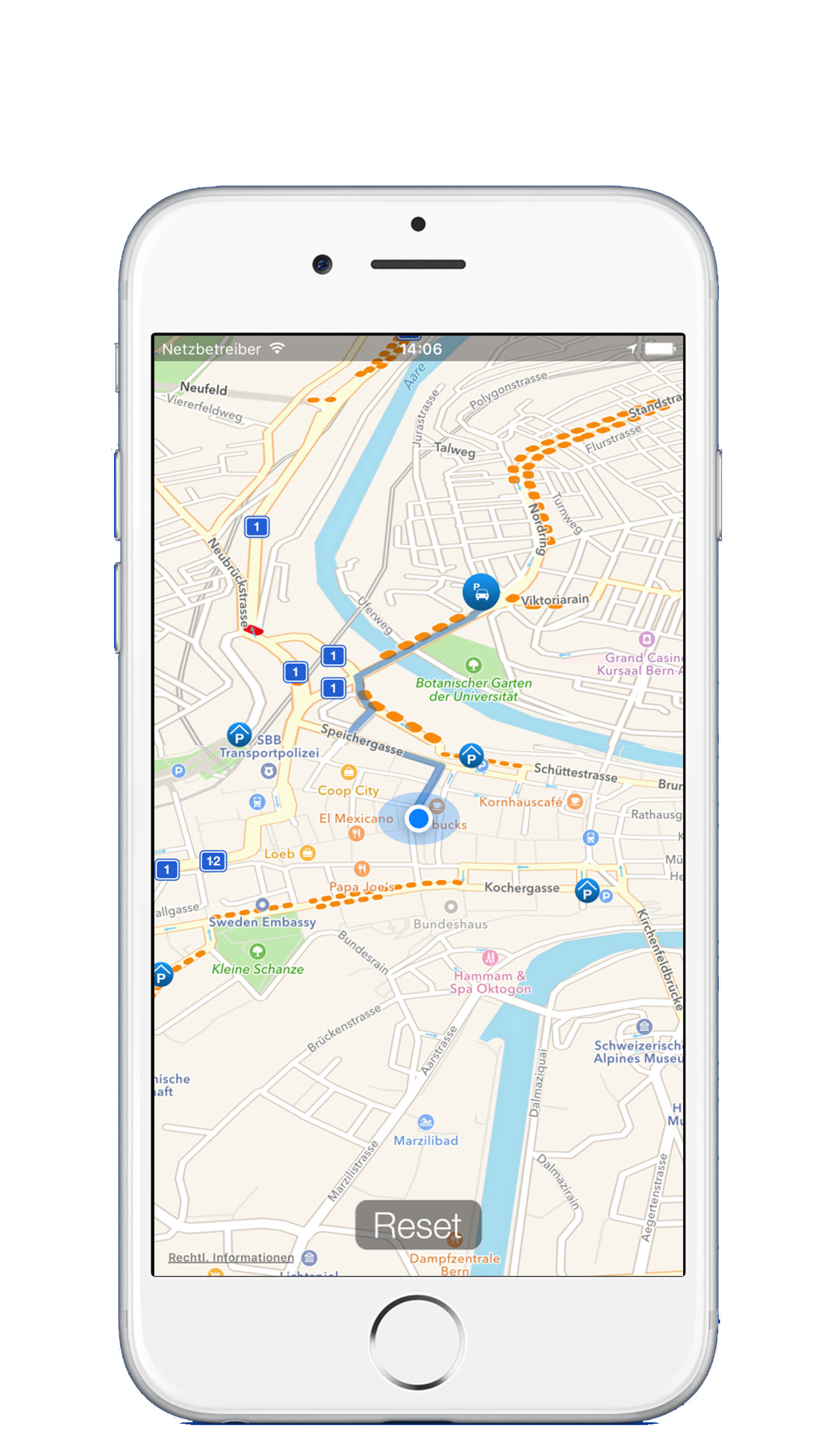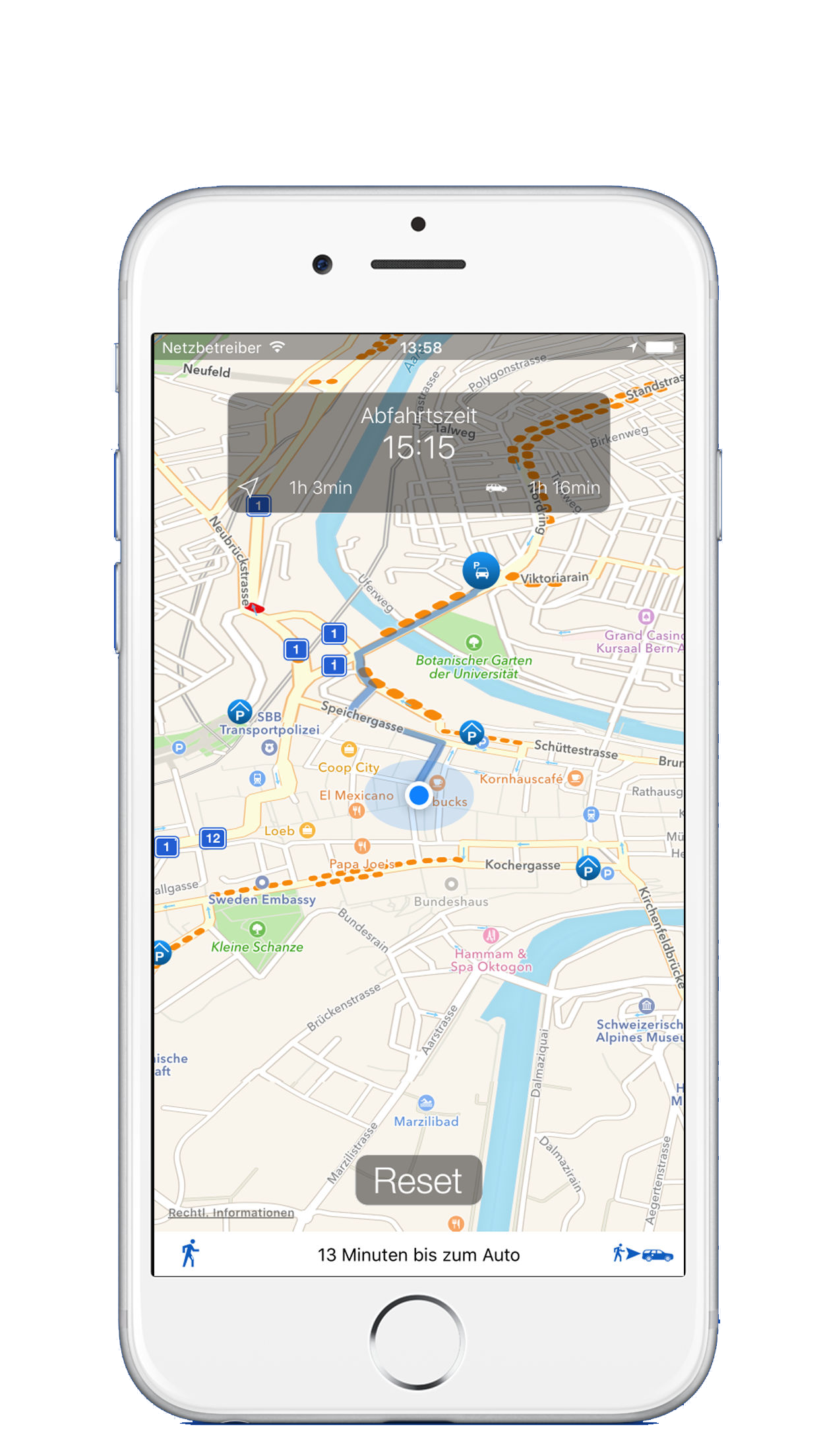 Die Swiss Parking ist eine clevere Weiterentwicklung der Idee des Parking Finder. Die App speichert sich den Standort des Parkplatzes und rechnet den Weg vom aktuellen Standort zurück zum Auto. Selbst im Hintergrund warnt die App den Benutzer rechtzeitig zum Auto zurückzukehren.